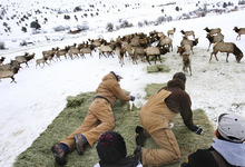 Ranch staffers feed the elk about 10 pounds of food per animal each day with hay grown on the ranch and augmented with alfalfa.