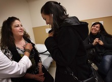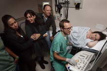 The technician steadied the wand on Allyson Gamble's chest as she lay curled up on the hospital bed against the wall. Gamble squeezed López's hand. Tight.