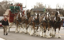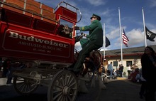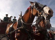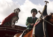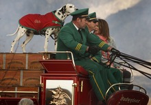 Drivers Roman Raber and Dennis Knepp and Gus the dalmation steer a team of Budweiser Clydes