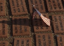 A small American flag pokes through the ground between pavers placed in remembrance of war