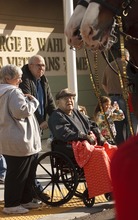 Mike Buckmaster, his wife, Kathy, and his father, Joe Buckmaster, 94, watch the team of horses. Joe Buckmaster fought in the Battle of the Bulge. The Budweiser Clydesdale team visits veterans and their families at the George E. Wahlen Veterans Home on Friday in Ogden. The Utah Department of Veterans Affairs held a Pearl Harbor remembrance ceremony at the home.