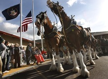 Drivers Roman Raber and Dennis Knepp and Gus the dalmation steer a team of Budweiser Clydesdale. The team visited veterans and their families at the George E. Wahlen Veterans Home on Friday in Ogden. The Utah Department of Veterans Affairs held a Pearl Harbor remembrance ceremony at the home.
