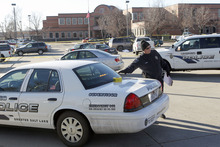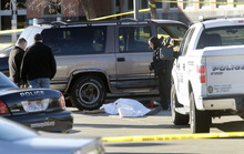 Unified Police investigate a crime scene on the north side parking lot of Workforce Services at 5680 South Redwood Road where a Unified police officer shot and killed a man who was attacking a woman in a brown SUV.