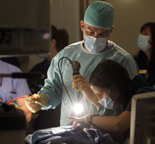 Dr. Richard Orlandi, ear, nose and throat specialist from the University of Utah School of Medicine, left, performs an endoscopic procedure, as Dr. Erika Crook, associate veterinarian, checks Eli, a black howler monkey undergoing a sinus operation at L.S. Skaggs Animal Health Center at Hogle Zoo Tuesday, Dec. 18.
