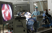 Dr. Richard Orlandi, ear, nose and throat specialist from the University of Utah School of Medicine, performs an endoscopic procedure on Eli, a black howler monkey undergoing a sinus operation at L.S. Skaggs Animal Health Center at Hogle Zoo Tuesday, Dec. 18. An image on the monitor at left shows the view of the monkey's infected sinus from the endospcopic camera.