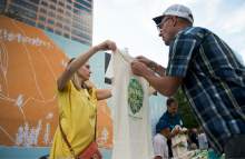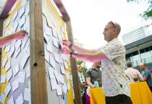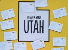 At a yellow kiosk on Gallivan Plaza, visitors scrawled their favorite Utah memories on postcards and stuck them to a large map of Utah.