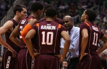 Virginia Tech Hokies head coach James Johnson gathers his team after he received a technical foul in the first half.
