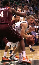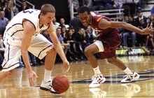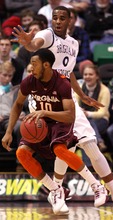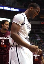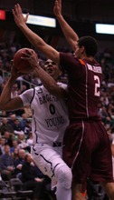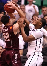 Brigham Young Cougars forward Brandon Davies (0) and Virginia Tech Hokies guard Marquis Rankin (10).