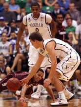 Brigham Young Cougars guard Tyler Haws (3), Brigham Young Cougars guard Craig Cusick (2) an