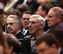 Former Utah Jazz coaches Phil Johnson, Jerry Sloan and current Executive VP of Operations Kevin O'Connor watch as Brigham Young University defeats Virginia Tech 97-71, Saturday December 29, 2012 in Salt Lake City at Energy Solutions Arena.