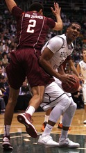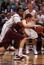 Brigham Young Cougars guard Cory Calvert (23) steals the ball from Virginia Tech Hokies guard Erick Green (11).
