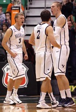 Brigham Young Cougars guard Tyler Haws (3), Brigham Young Cougars guard Craig Cusick (2) and Brigham Young Cougars guard Brock Zylstra (13) celebrate a foul on Virginia Tech.