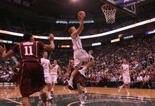 BYU hit 60 percent of its shots, including 7 of 14 from 3 in the first, and choked the Hokies at the other end with a zone, holding them to 30 percent shooting. With the ball repeatedly going to Brandon Davies in the low post, and Davies delivering it in timely fashion to open spot-up shooters, the Cougars punished Va. Tech. Haws provided most of the cruelty.