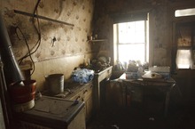 Royce warned against looking in the bathroom. "It'll gross you out. There's no running water." Its low ceiling is festooned with spider webs. Buckets of dark liquid stagnate in the bathtub.