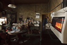The wood of his living room floor is soft, with gaps between the boards. One wall of his kitchen is deeply warped, a wave crested by dangling insulation. Towers of soiled books Rise of the Romans, Ancient Iraq, Search for Significance pack the living room. A greasy black film described by one neighbor as "fungus" covers everything.