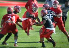 Utah RB Zack Moss hops through a hole during the first day of Utah fall football cam