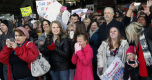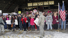 Children waved flags and hoisted signs welcoming home their parents, aunts and uncles.