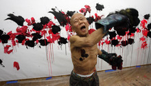81-year-old old Japanese artist, Ushio Shinohara, warms up before punching his art on to the