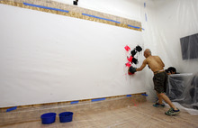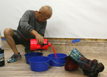 81-year-old old Japanese artist, Ushio Shinohara, pours paint before dipping his boxing gloves, at the Central Utah Art Center, Monday, January 21, 2013. Shinohara, is featured in the Sundance documentary film "Cutie and the Boxer."