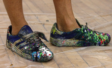 81-year-old old Japanese artist, Ushio Shinohara, changed into his painting shoes, before punching his art on to the canvas, with boxing gloves covered in sponges, at the Central Utah Art Center, Monday, January 21, 2013. Shinohara, is featured in the Sundance documentary film "Cutie and the Boxer."