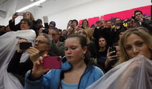 The crowd cheers as Japanese artist, Ushio Shinohara, finishes his piece of art, at the Central Utah Art Center, Monday, January 21, 2013. Shinohara, is featured in the Sundance documentary film "Cutie and the Boxer."