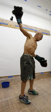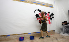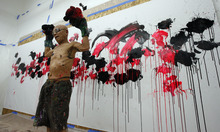 81-year-old old Japanese artist, Ushio Shinohara, punches his art on to the canvas, with boxing gloves covered in sponges, at the Central Utah Art Center, Monday, January 21, 2013. Shinohara, is featured in the Sundance documentary film "Cutie and the Boxer."
