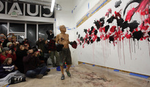 THe crowd prepares to watch 81-year-old old Japanese artist, Ushio Shinohara, punch his art o
