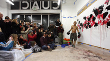 The crowd cheers as Japanese artist Ushio Shinohara exults in front of the canvas art he created using paint and boxing gloves. Shinohara staged his presentation Jan. 21 at the Central Utah Art Center in downtown Salt Lake City following a screening of Zachary Heinzlering's Sundance documentary film "Cutie and the Boxer," which profiles Shinohara's art and 40-year marriage to his wife, Noriko.