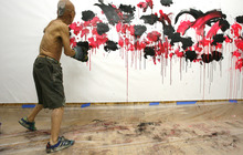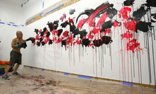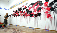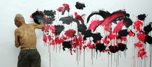 81-year-old old Japanese artist, Ushio Shinohara, pours paint before dipping his boxing glov