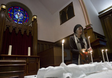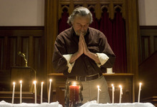 Tomoko Moses, speaking at Sunday's service, recounted her childhood in Japan in the 1950s. Her family had no television, Moses said, so they learned of the Nevada nuclear tests from news reels shown at a nearby movie theater.