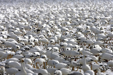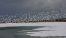 The flocks of migrating snow geese take a break during their trip at Gunnison Bend Reservoir and perhaps again a little farther north near the Bear River Migratory Bird Refuge.