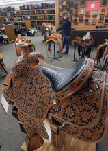 All are Western saddles, designed for riders spending long hours on a mount and traveling over rugged terrain. Saddles also have variations to accommodate specific tasks, such as cutting, barrel racing or endurance competitions. Most saddles are custom made and all are hand tooled.