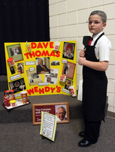 Third-grader Cade Gillen poses as Dave Thomas in the wax museum at Copper Canyon Elementary School in West Jordan, Thursday, February 21, 2013. The annual mock wax museum is a third-grade research project.