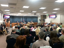 With standing room only, residents packed the council chambers holding orange octagon-shaped signs or wearing stickers stating "Stop #3." The city council decided during the discussion to have the city move forward with a gun range, but not with plans for a temporary site at location three, which was within just more than a mile of homes, two elementary schools and three churches.