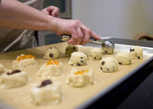 Once dough is chilled, heat oven to 350 degrees. Scoop out tablespoon-size portions of dough and roll into balls using your hands. Place cookie balls onto a parchment-lined baking sheet and slightly flatten using the palm of your hand.