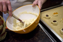 Using your thumb or a 1/4-size teaspoon, gently press each cookie to form a small well in the center to hold the jam.