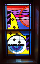 Five colorful, stained-glass-like windows, designed by congregant Linda Zeveloff after the fire, adorn the walls. One represents the Torah, or Hebrew Bible, and the other four signify the seasons. The winter window, for example, features icy blues and red-orange squares scattered like stars through the sky and meant to represent candles lit during Hanukkah.