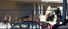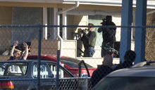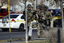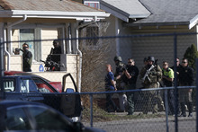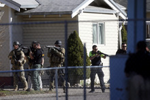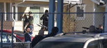 Law enforcement officers take a suspect into custody near the scene of a shooting at 1159 S. Foulger Street Tuesday March 19, 2013. The shooting occurred as members of the Joint Criminal Apprehension Team surrounded a home in the area of 1100 South between State and Main streets.