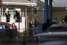 With their guns trained on her, police direct a woman as she exits a house on Foulger Street between State and Main.