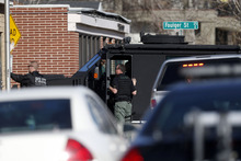 Law enforcement officers take a suspect into custody near the scene of a shooting at 1159