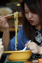 Newcomers may find that eating a huge bowl of ramen noodles can be problematic simply because there's no graceful way to do it.