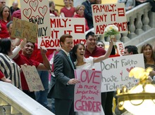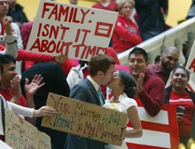 To a roar of applause, bride and groom to be, Jordan and Amanda, who did not want to give their last names, kiss as they stand with people who showed up in opposition to the Celebration of Marriage event, hosted by Alan and Suzanne Osmond, at the Utah State Capitol in Salt Lake City, Utah Tuesday March 26, 2013. The couple was at the Capitol to take their wedding pictures without knowing about the event. The Celebration of Marriage event Coincides with Prop 8 oral arguments before The US Supreme Court. A coalition of pro-family Utah organizations sponsored the event. "My wife Suzanne and I are so pleased to be a part of the Celebration of Marriage," said Alan Osmond. "Every child deserves the chance to be raised in a home with a mom and dad. Though that's not always possible, it is the ideal society should strive for and promote because of the unparalleled good it does for our kids, families and communities."