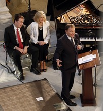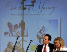 Utah Governor Gary R. Herbert talks during the Celebration of Marriage event, hosted by Alan and Suzanne Osmond, at back, at the Utah State Capitol in Salt Lake City, Utah Tuesday March 26, 2013. The Celebration of Marriage event Coincides with Prop 8 oral arguments before The US Supreme Court. A coalition of pro-family Utah organizations sponsored the event. "My wife Suzanne and I are so pleased to be a part of the Celebration of Marriage," said Alan Osmond. "Every child deserves the chance to be raised in a home with a mom and dad. Though that's not always possible, it is the ideal society should strive for and promote because of the unparalleled good it does for our kids, families and communities."