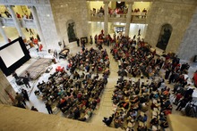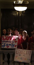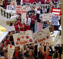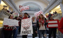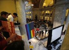 Attendees listen to a speaker during the Celebration of Marriage event, hosted by Alan and Suzanne Osmond, at the Utah State Capitol in Salt Lake City, Utah Tuesday March 26, 2013. The Celebration of Marriage event Coincides with Prop 8 oral arguments before The US Supreme Court. A coalition of pro-family Utah organizations sponsored the event. "My wife Suzanne and I are so pleased to be a part of the Celebration of Marriage," said Alan Osmond. "Every child deserves the chance to be raised in a home with a mom and dad. Though that's not always possible, it is the ideal society should strive for and promote because of the unparalleled good it does for our kids, families and communities."
