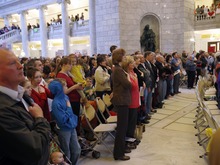 Attendees sing the National Anthem during the Celebration of Marriage event, hosted by Alan and Suzanne Osmond, at the Utah State Capitol in Salt Lake City, Utah Tuesday March 26, 2013. The Celebration of Marriage event Coincides with Prop 8 oral arguments before The US Supreme Court. A coalition of pro-family Utah organizations sponsored the event. "My wife Suzanne and I are so pleased to be a part of the Celebration of Marriage," said Alan Osmond. "Every child deserves the chance to be raised in a home with a mom and dad. Though that's not always possible, it is the ideal society should strive for and promote because of the unparalleled good it does for our kids, families and communities."