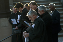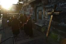 The Rev. Michael J. Imperiale, pastor of First Presbyterian Church, and other faith leaders pray during the Good Friday Procession of the Cross Friday March 29, 2013. Since 1983, the Salt Lake Council of Churches has sponsored this annual procession, which is similar to the tradition of the "Via Dolorosa" (Way of Suffering), where pilgrims to Jerusalem follow the path Jesus took to the cross.