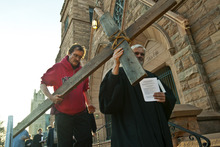 Alex Bury, of Sunset, and the Rev. Michael J. Imperiale, pastor of First Presbyterian Church, carry a wooden cross from First Presbyterian Church during the Good Friday Procession of the Cross Friday March 29, 2013. Since 1983, the Salt Lake Council of Churches has sponsored this annual procession, which is similar to the tradition of the "Via Dolorosa" (Way of Suffering), where pilgrims to Jerusalem follow the path Jesus took to the cross.
