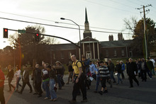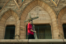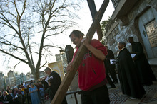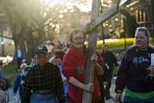 Alex Bury, of Sunset, carries a wooden cross from the Cathedral of the Madeleine to First Presbyterian Church during the Good Friday Procession of the Cross Friday March 29, 2013. Since 1983, the Salt Lake Council of Churches has sponsored this annual procession, which is similar to the tradition of the "Via Dolorosa" (Way of Suffering), where pilgrims to Jerusalem follow the path Jesus took to the cross.