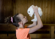 Gracie McCain holds a baby rabbit in the Savage Livery Stable during Baby Animal Season at This is the Place Heritage Park in Salt Lake City on April 1, 2013.
