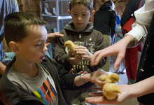 Brothers (left) Jon and Ryan Chapman hold baby chicks in the Savage Livery Stable during Baby Animal Season at This is the Place Heritage Park in Salt Lake City on April 1, 2013. The event will continue until May 24.